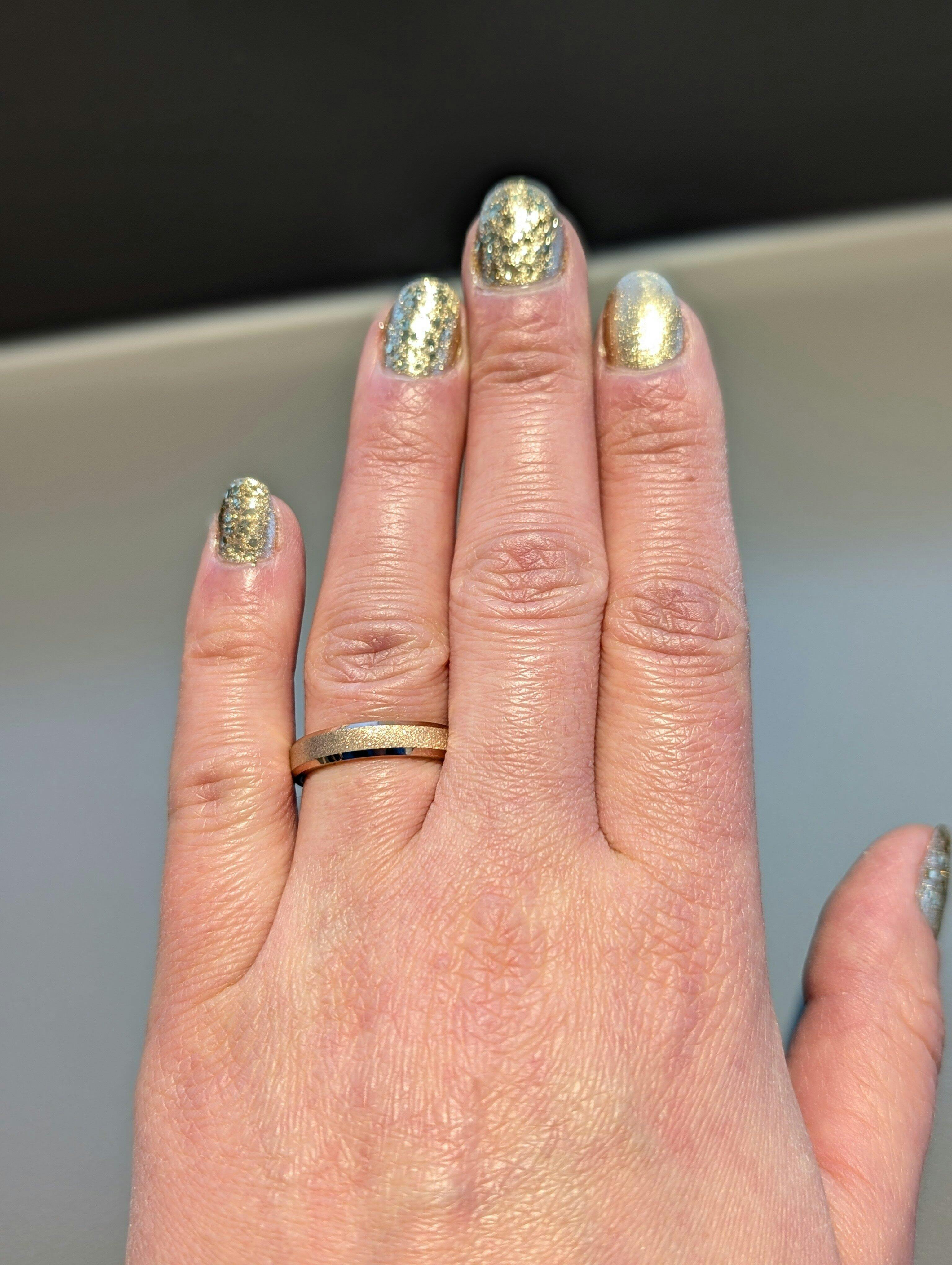 This beautiful Tungsten ring is a 4mm sandblasted rose gold band with high polished bevelled edges. It is the perfect wedding band that gives the classic ring an updated look with the gorgeous sandblasted effect.