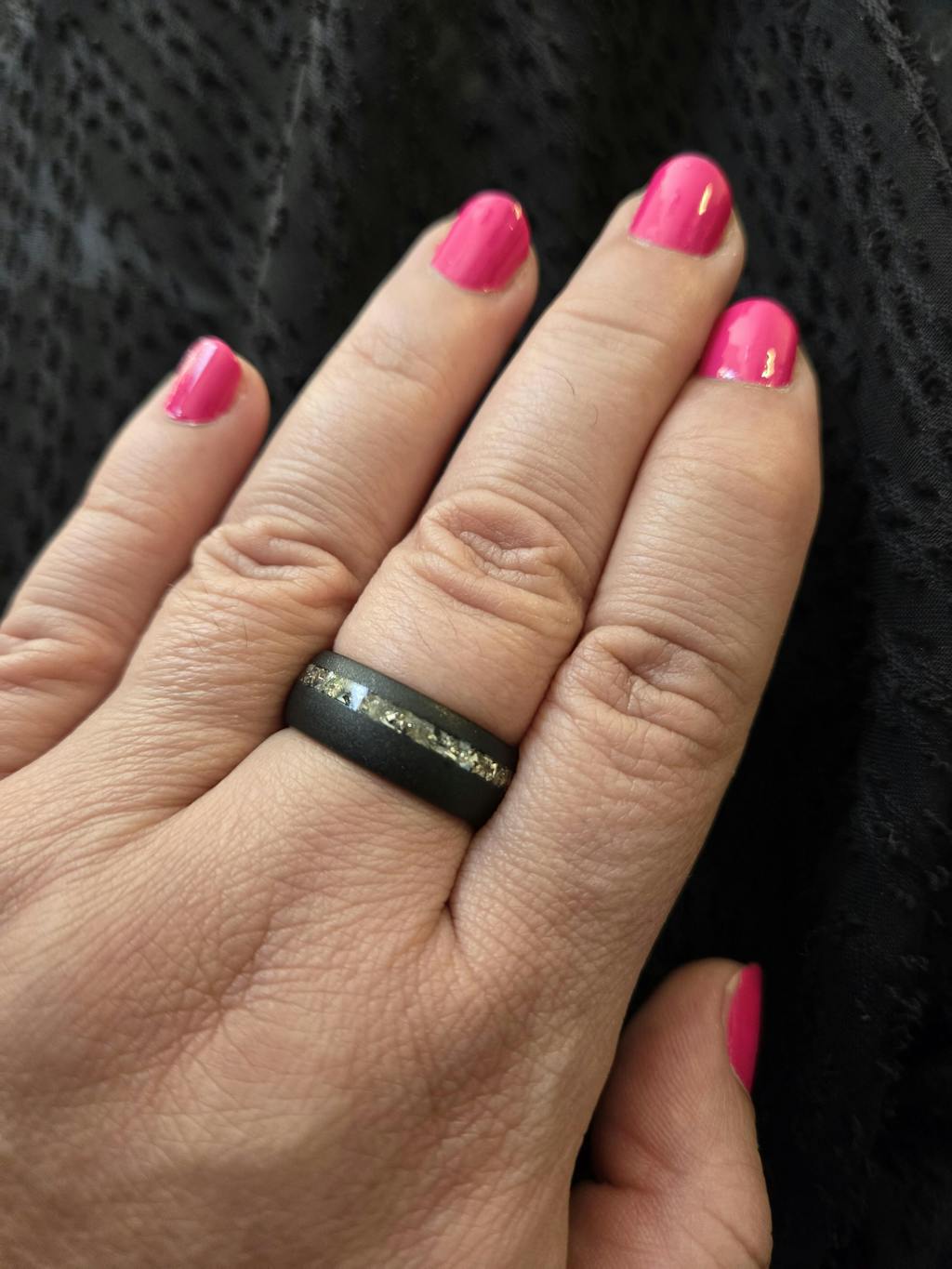 This domed Tungsten ring is an 8mm sandblasted black ring with a German silver glass center. When the light hits the ring, it shimmers slightly to give the ring a unique look. Elegant and refined, this would make a perfect choice for a wedding band or fashion piece for that stylish person in your life.