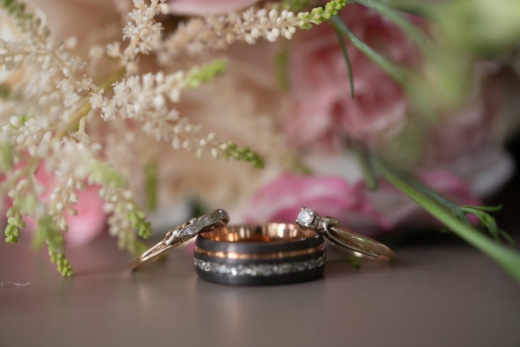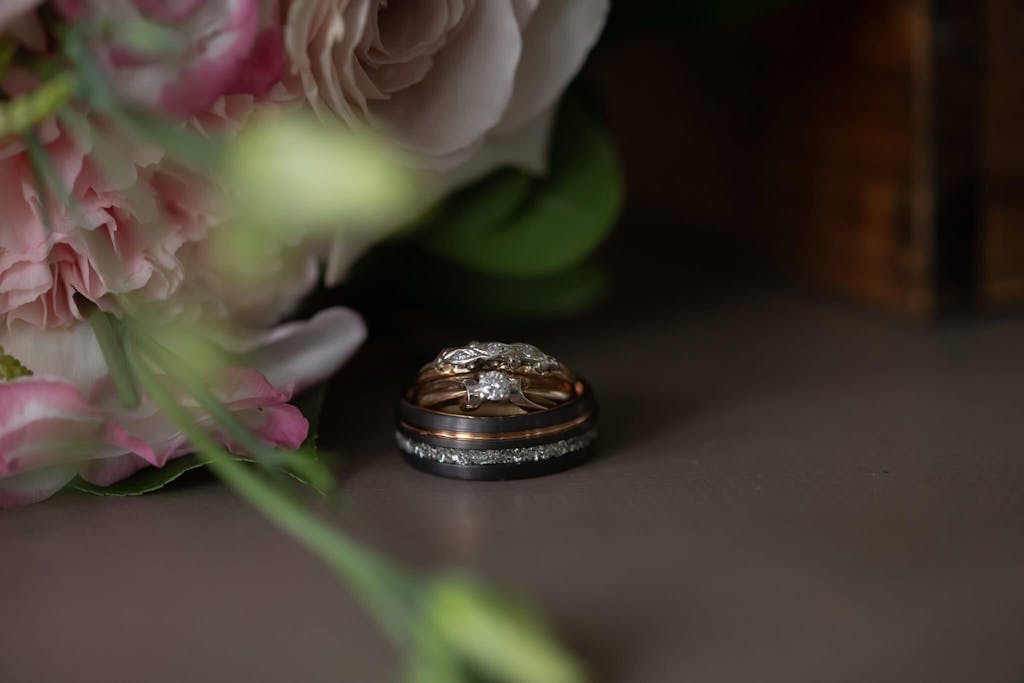 This domed Tungsten ring is an 8mm brushed gunmetal grey with a German glass center and a rose gold accent stripe. This ring is definitely unique in style, and the comfort fit band makes for easy wearing all day, every day!