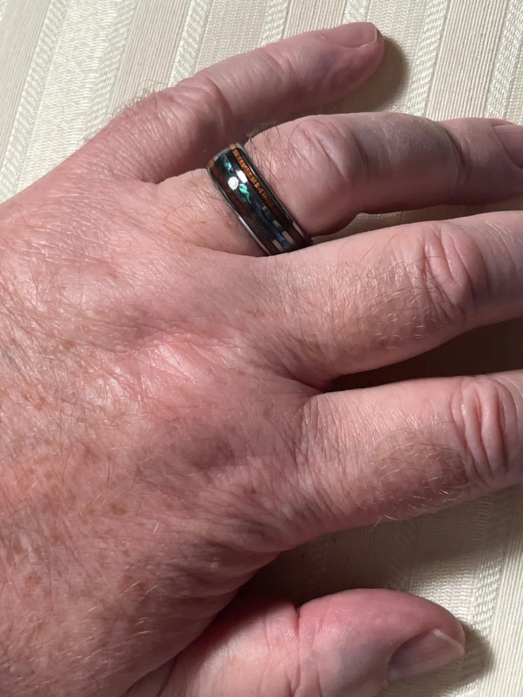 Bring together natural beauty and modern craftsmanship with this 8mm Tungsten Ring featuring Koa Wood and Shell Inlay. The rich Koa wood center, known in Hawaiian culture for symbolizing strength, bravery, and integrity, is paired with a vibrant abalone shell inlay that reflects stunning ocean-inspired colors. This striking combination creates a bold contrast that feels both refined and unique.