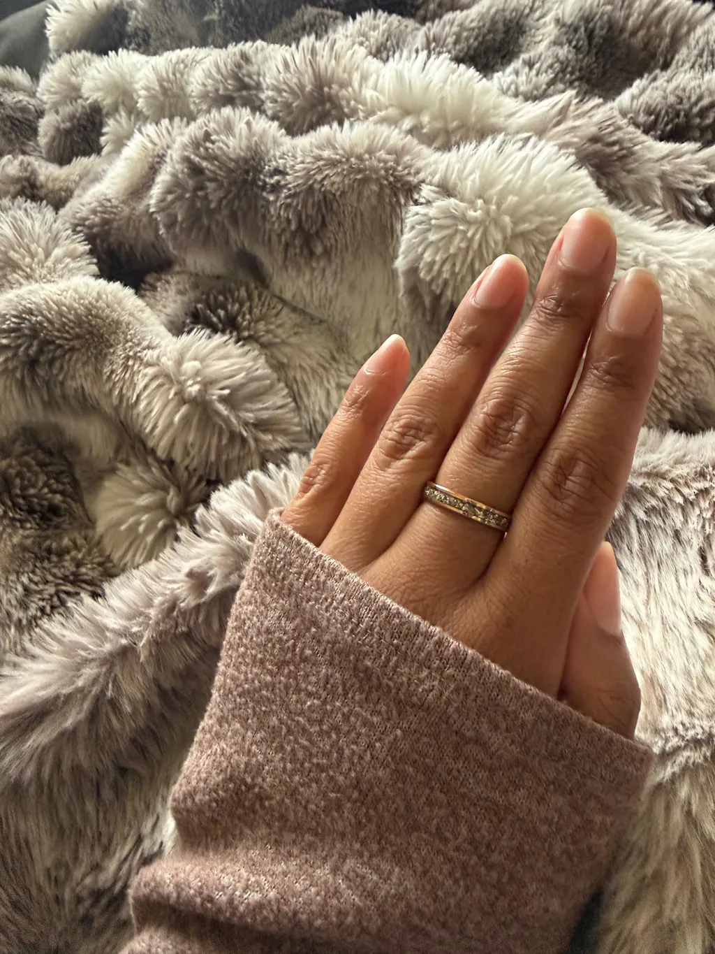 Radiant sparkle meets modern elegance in this Rose Gold Tungsten Ring with German Silver Glass Inlay. The warm rose gold tungsten band is highlighted by a shimmering German silver glass center, designed to catch the light and create a subtle, gemstone-like brilliance. This luminous detail adds a refined sparkle that sets the ring apart from traditional wedding bands.